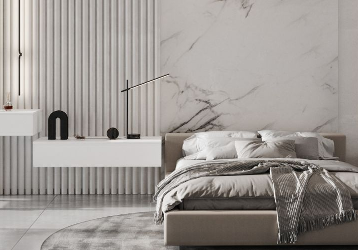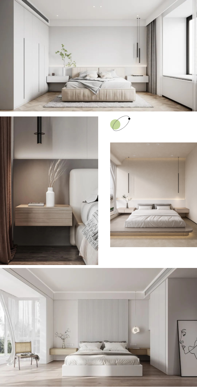 在卧室内做悬空设计的床头柜,与背景墙贴合,提供了收纳储物、置物功能,也打造出简洁干净、气质优雅的卧室格调。