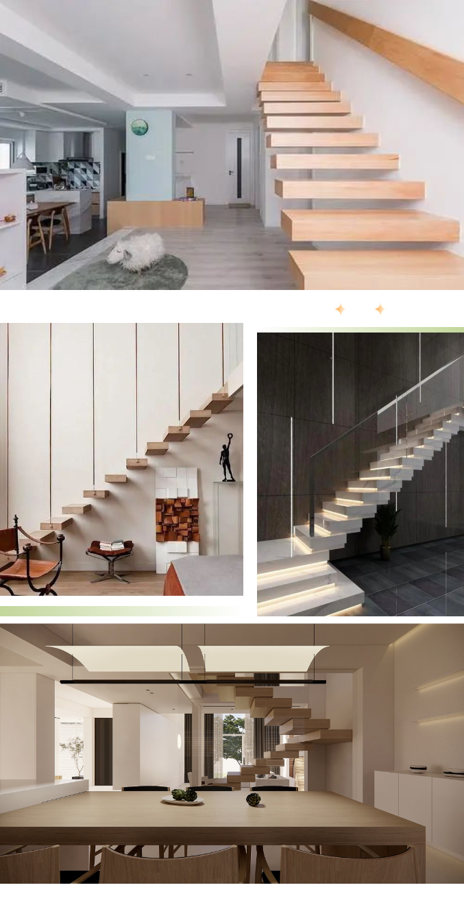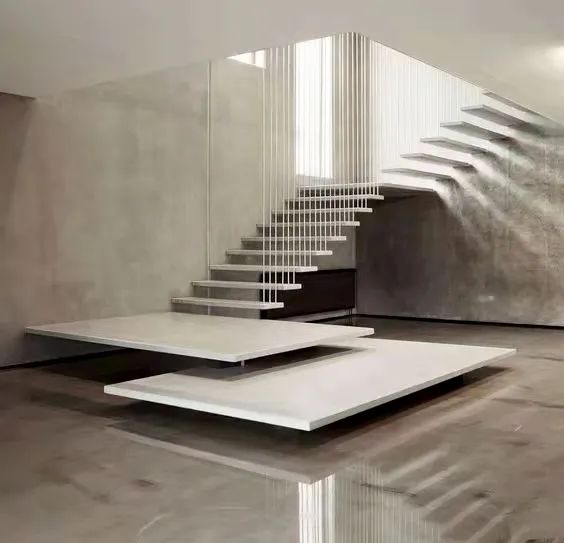 悬浮楼梯也很常见,新颖别致、轻盈优雅,从墙面延伸出来,给人一种楼梯飘在空中的感觉,削弱了楼梯本身的笨重感,让空间更加立体透亮。